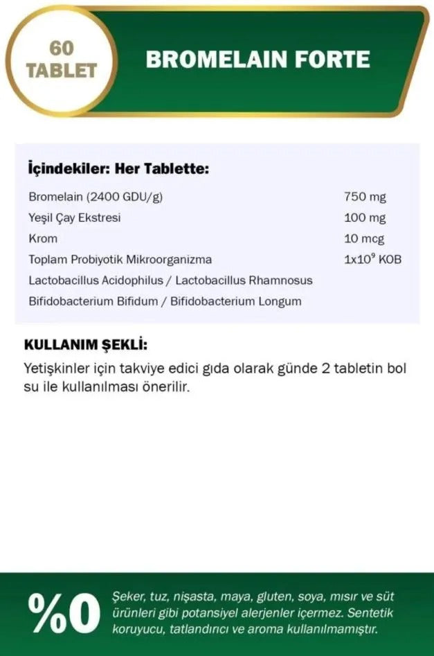 No synthetic preservatives, sweeteners, or flavors. Product Content Detailed Product Content Each Tablet: Bromelain (2400 GDU/g) 750 mg, Green Tea Extract 100 mg, Chromium 10 mcg, Total Probiotic Microorganism (Lactobacillus Acidophilus / Lactobacillus Rhamnosus, Bifidobacterium Bifidum / Bifidobacterium Longum) 1x10? CFU.